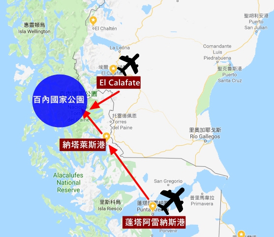 進入百內最近的城鎮就是智利的納塔雷斯港(Puerto Natales),不過飛機就可能要起飛在下面的蓬塔阿雷納斯港(Punta Arenas)或是智利的卡拉法特(El Calafate),基本上這三個城鎮都有定期巴士前往百內國家公園,最多班次的還是屬於納塔雷斯港(Puerto Natales),如果要到百內國家健行的人建議可以先在那塔雷斯港補給工具跟糧食。