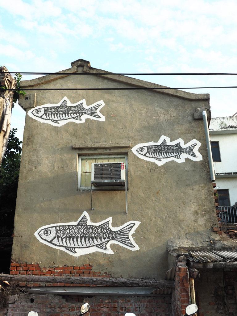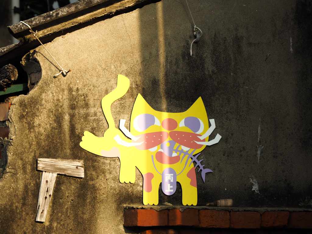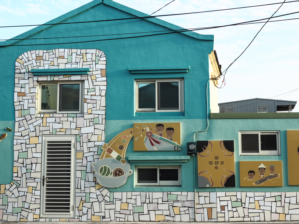 右側則有住家以及裝置藝術,住家門上跟窗都有可愛塗鴉以及意象。