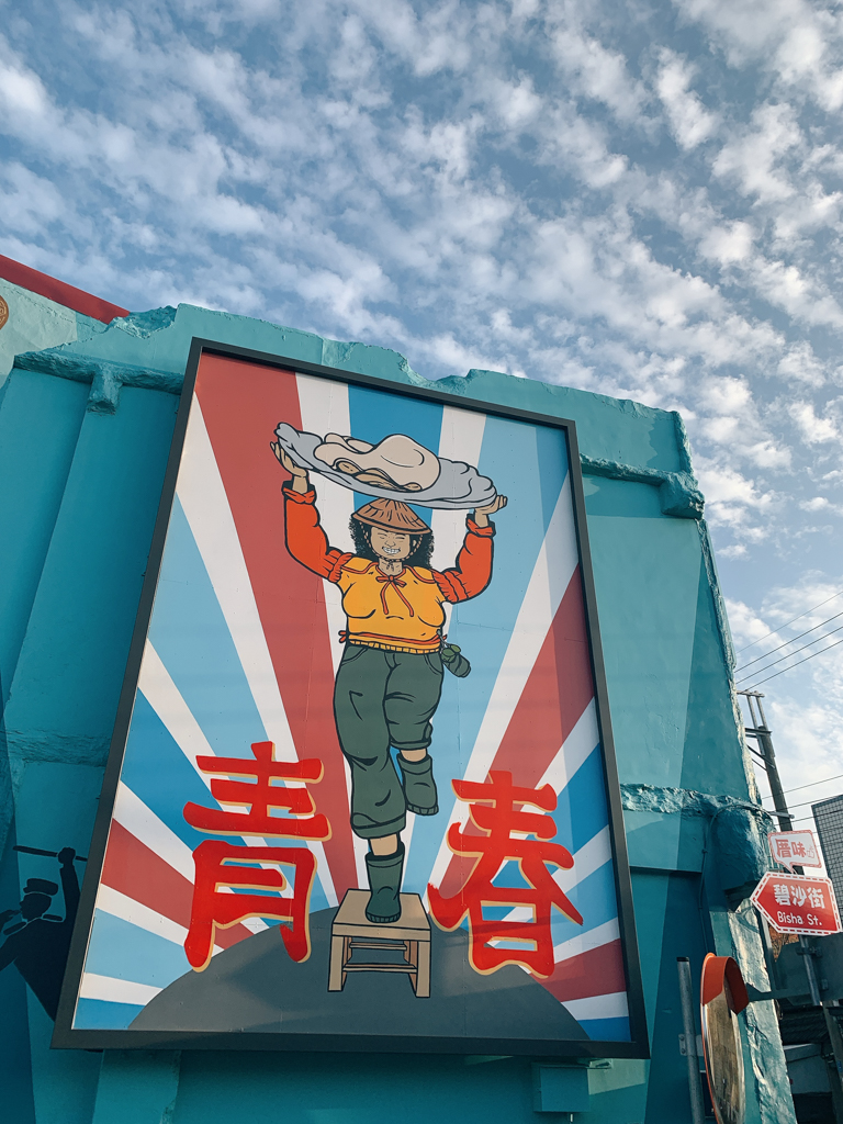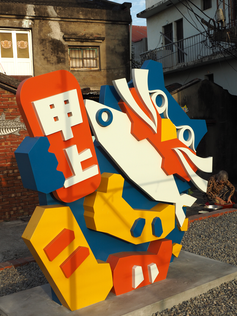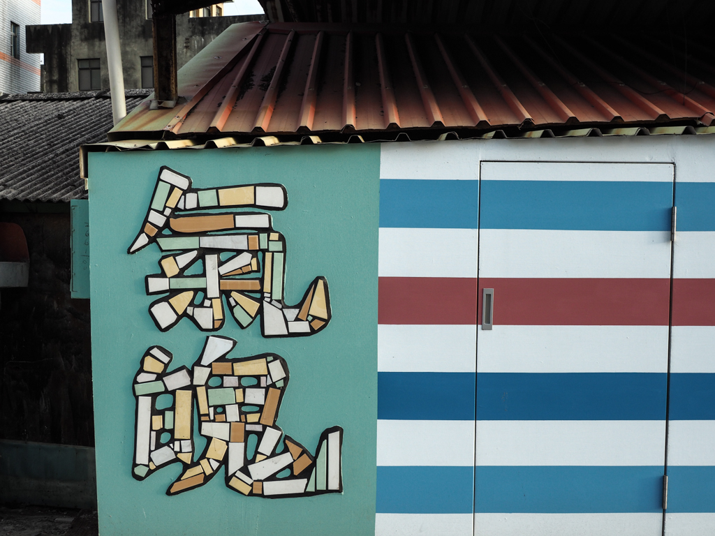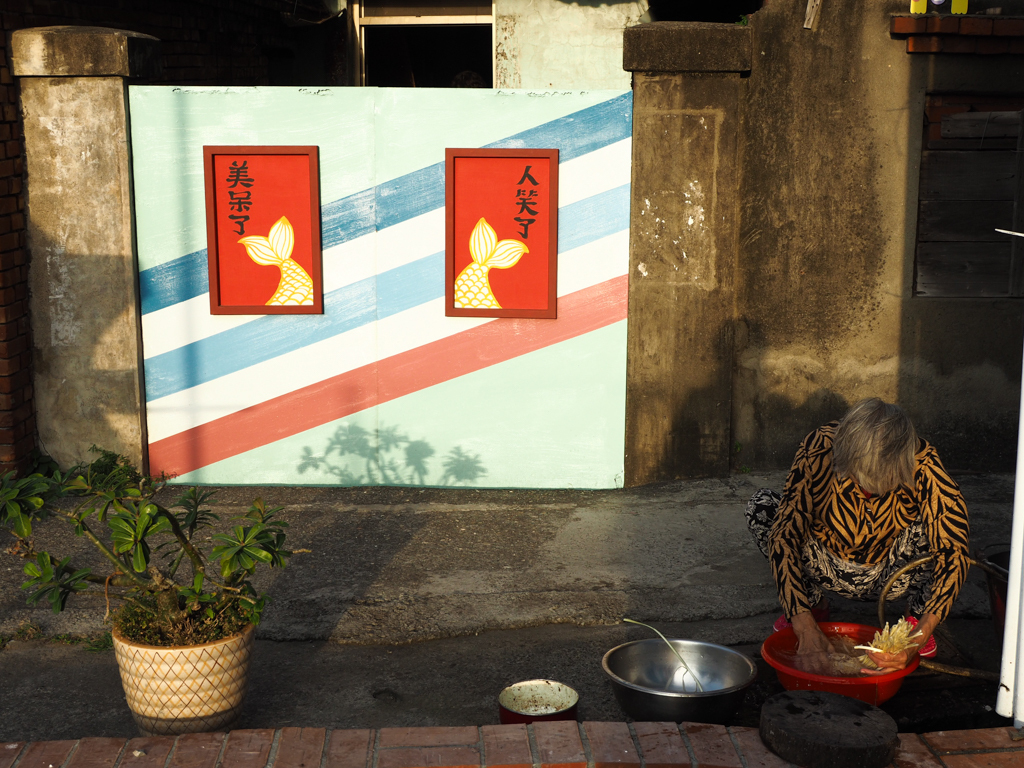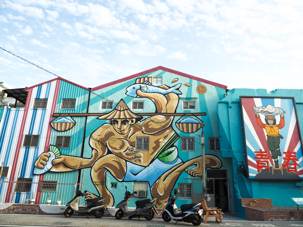 從嘉應廟走過來,就可以先看到以下的巨幅壁畫,代表青春與布袋的產業結合。