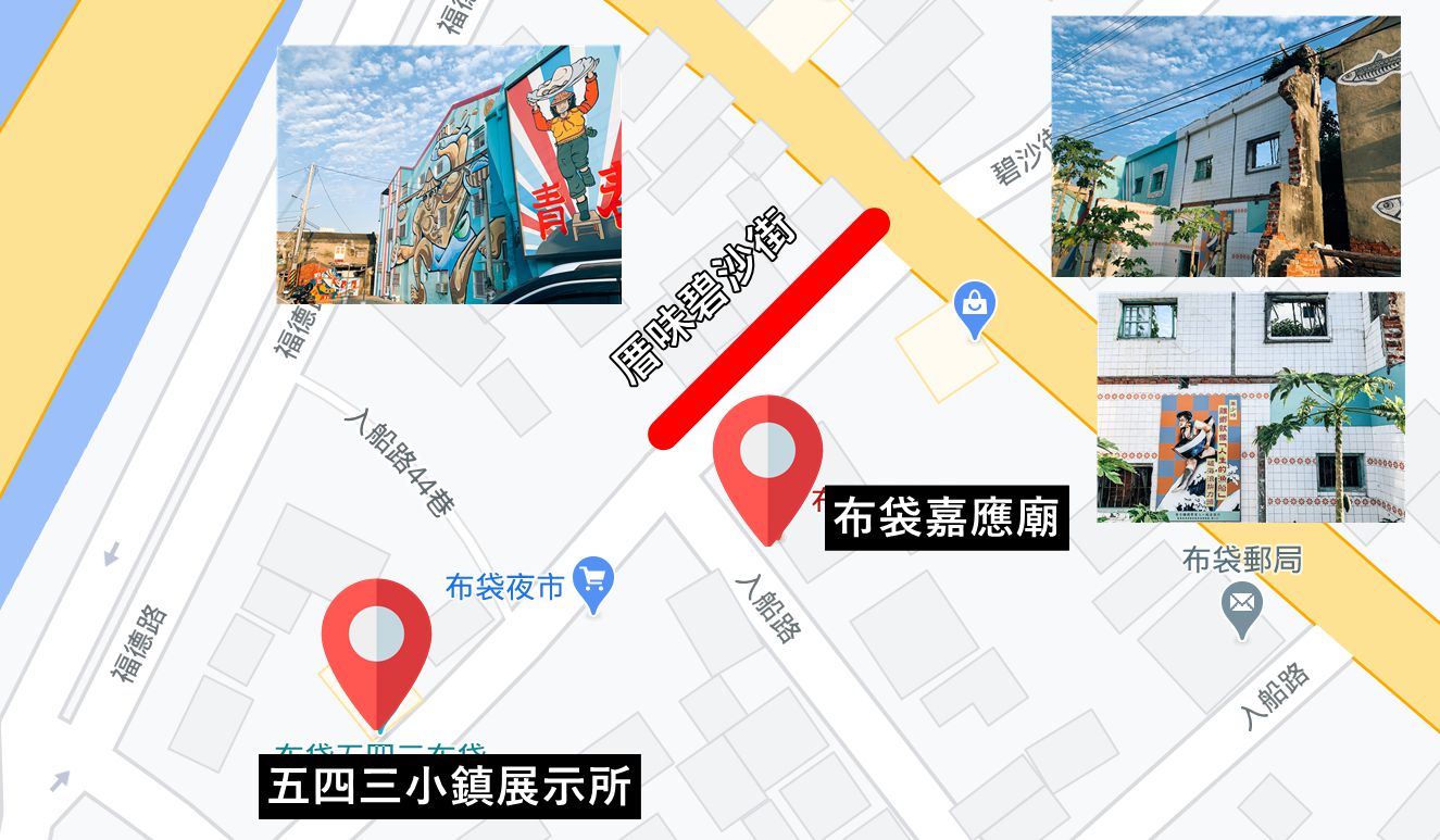 許多人對於布袋的映象都是高跟鞋教堂,不過似乎高跟鞋教堂還是無法滿足大老遠去濱海跑一趟的廣大群眾們,所以在2020年雲嘉南濱海國家風景區管理處就在「布袋五四三」故事館旁邊打造了一個有故事又有趣味的厝味碧沙街。