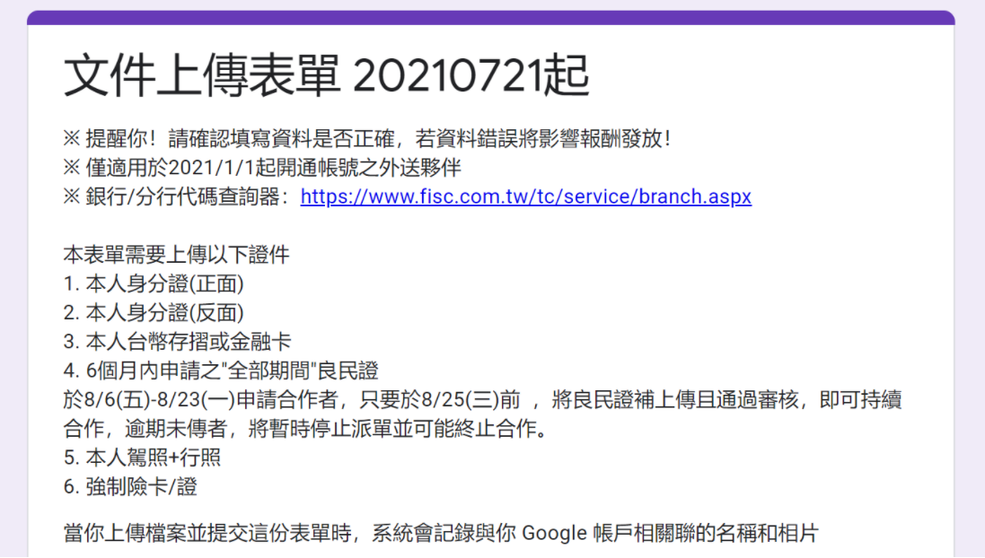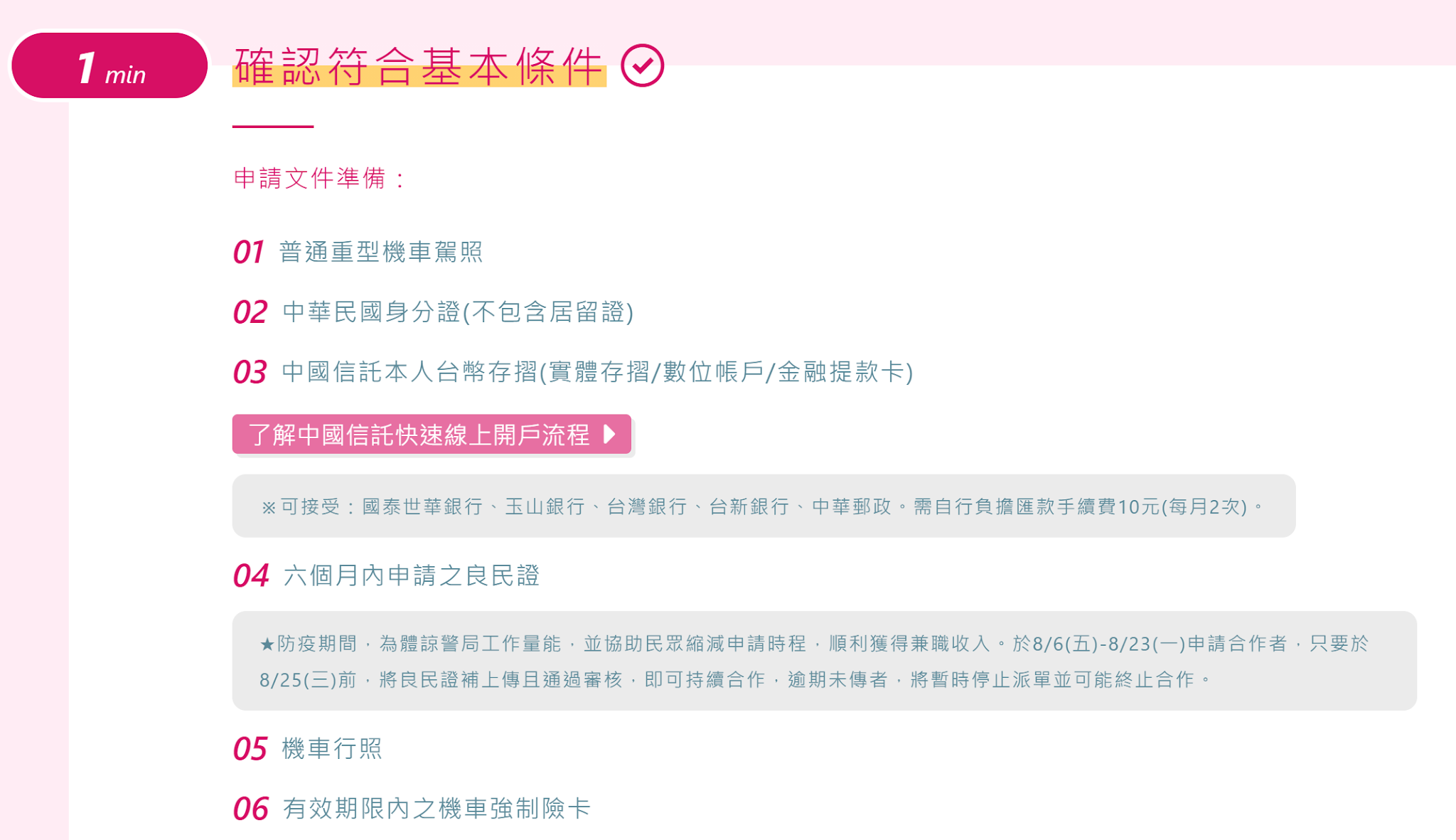 注意事項:*必備證件:中華民國身分證(不接受居留證)、本人之中國信託台幣帳戶、六個月內申請之全部區間、普通重型機車駕照(不接受輕型機車駕照或是小型車駕照)、行照和機車強制車險卡*防疫期間,為體諒警局工作量能,並協助民眾縮減申請時程,順利獲得兼職收入。於指定時間內申請合作者,可將良民證後補上傳,通過審核,即可持續合作,逾期未傳者,將暫時停止派單並可能終止合作。