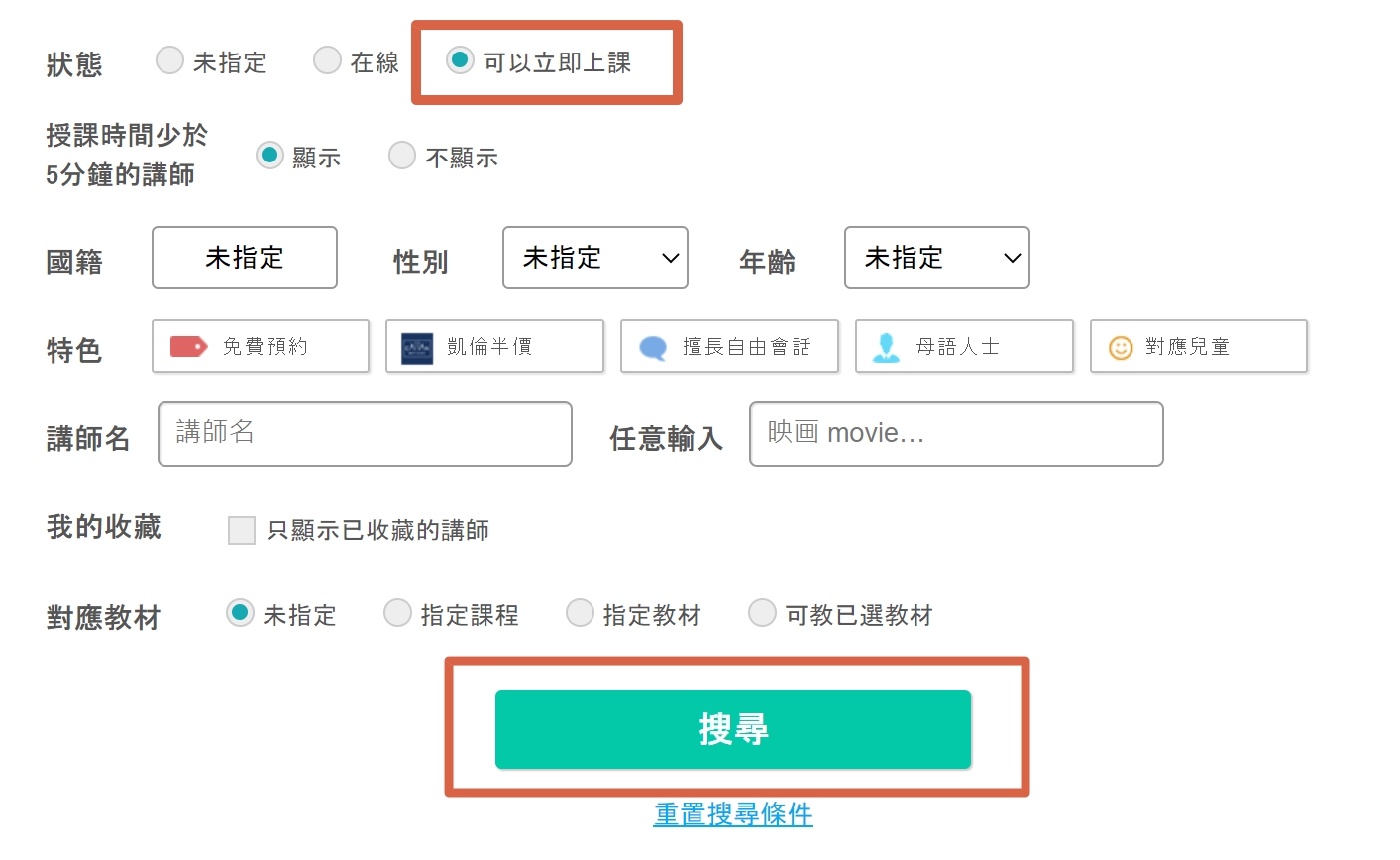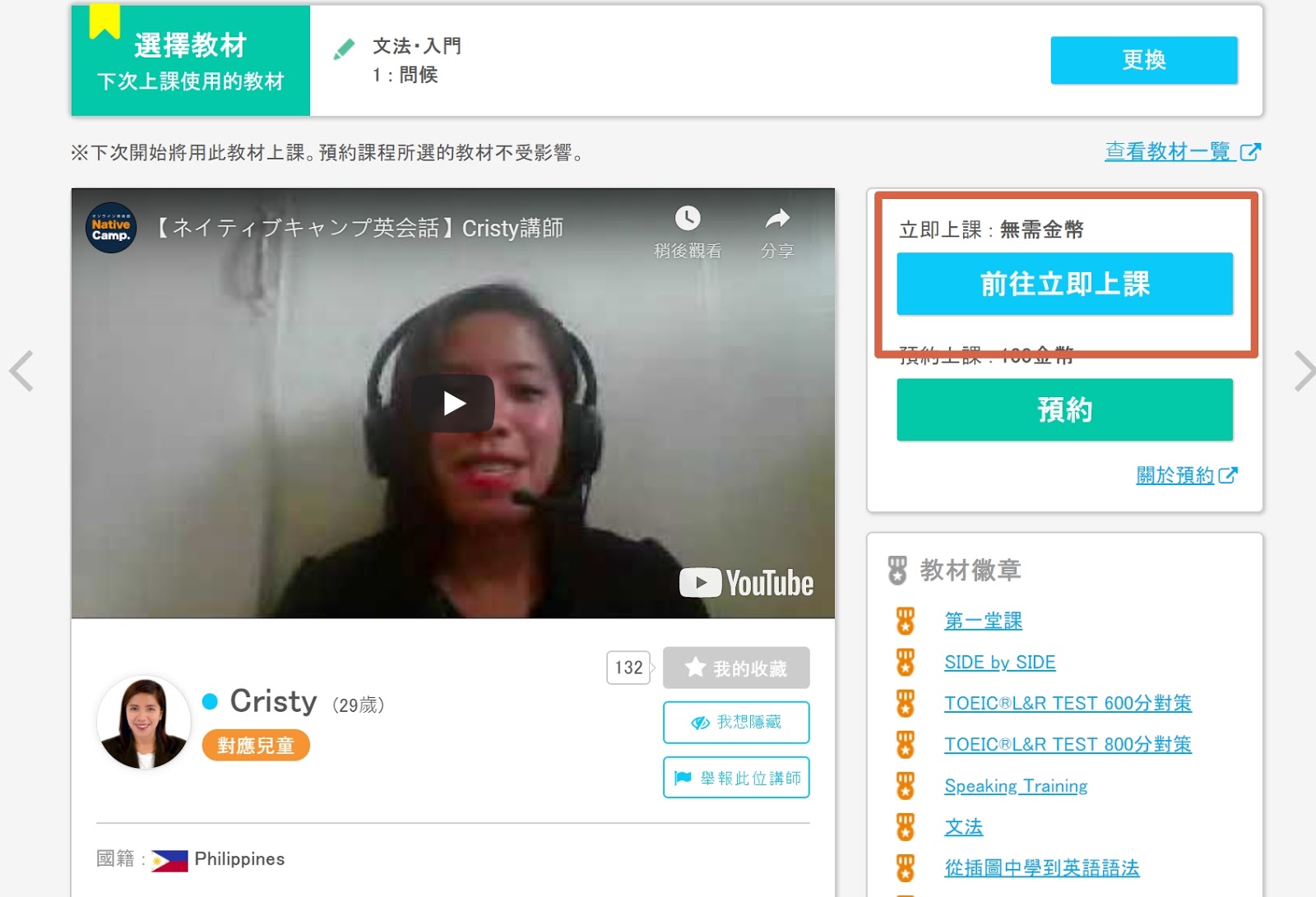 NATIVE CAMP.的特色就是隨時隨地都可以上課,然後沒有時間限制,所以登入之後就選擇「立即上課」以及條件搜尋。