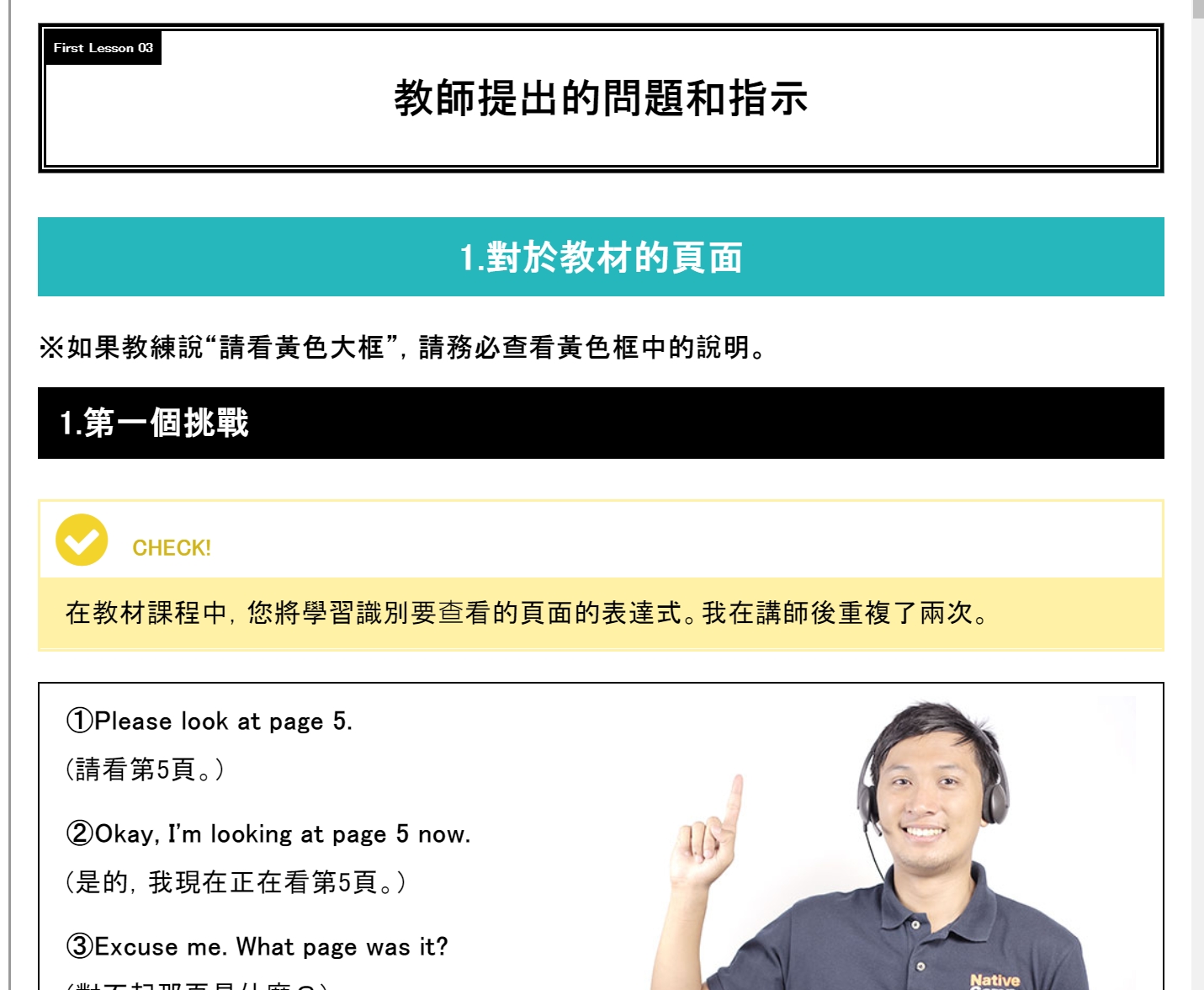 在 NATIVE CAMP.有很多教材,你可以從第一課開始學起,如果你需要更高深的教材,你可以選擇觀察教材,這裡面有付費跟免費,同時也可以依據你的需求做提供。