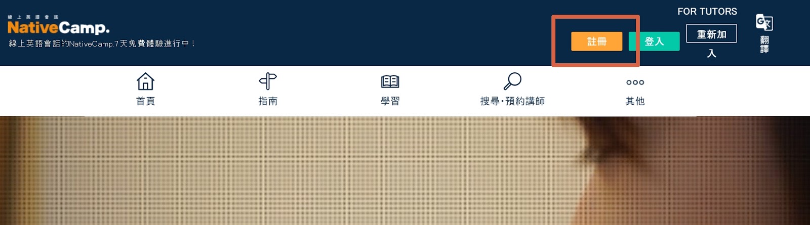 選擇網站:https://nativecamp.net/zh-tw,然後點選[註冊],就可以獲得免費7天的學習。