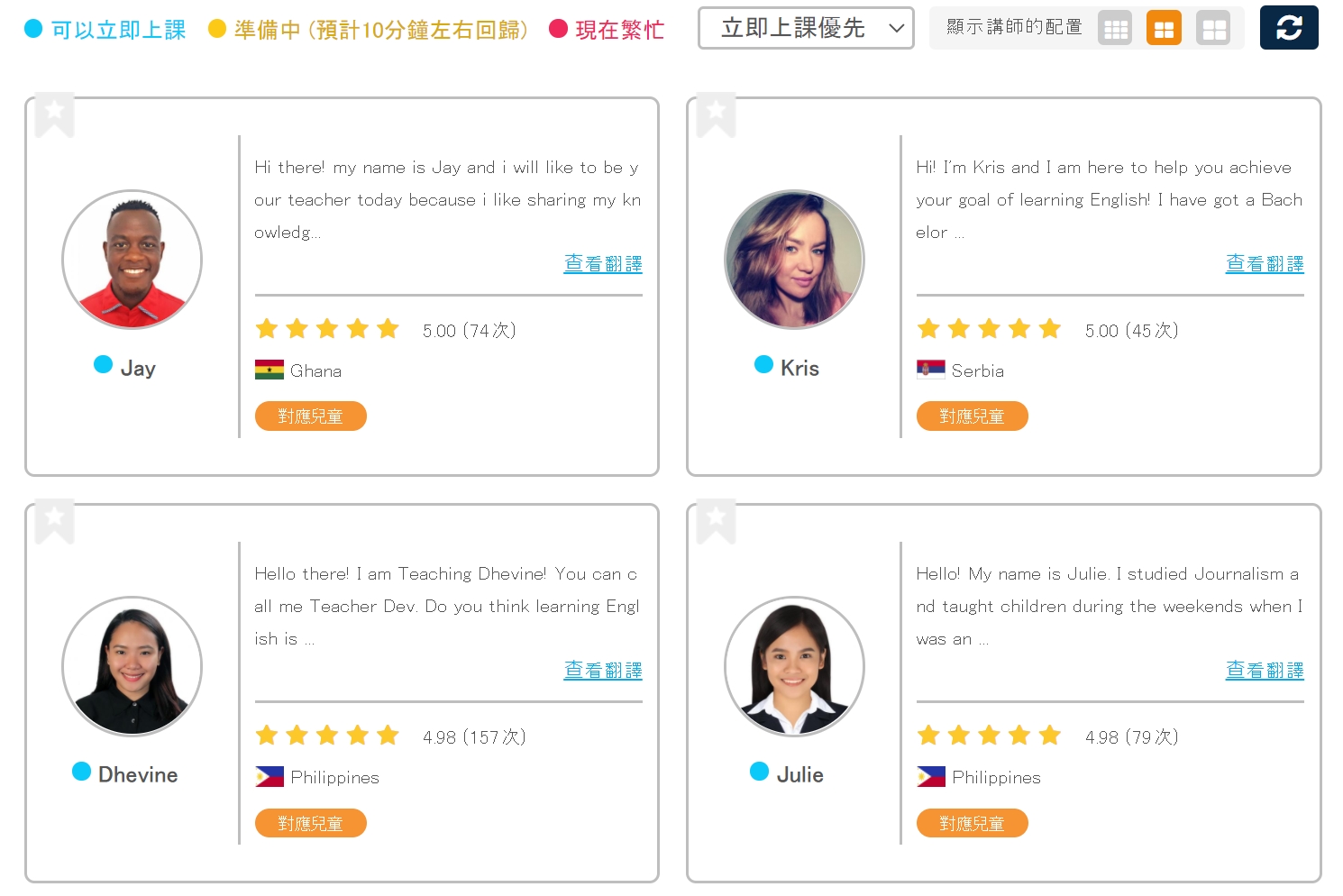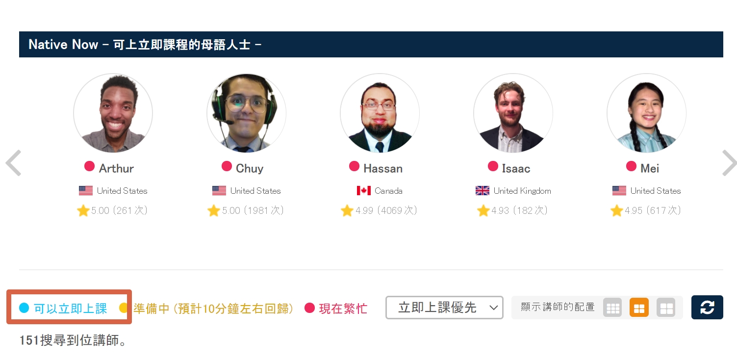 之後就會出現目前可以預約的老師人數,如果是有藍色按鈕就可以點選進去直接上課。