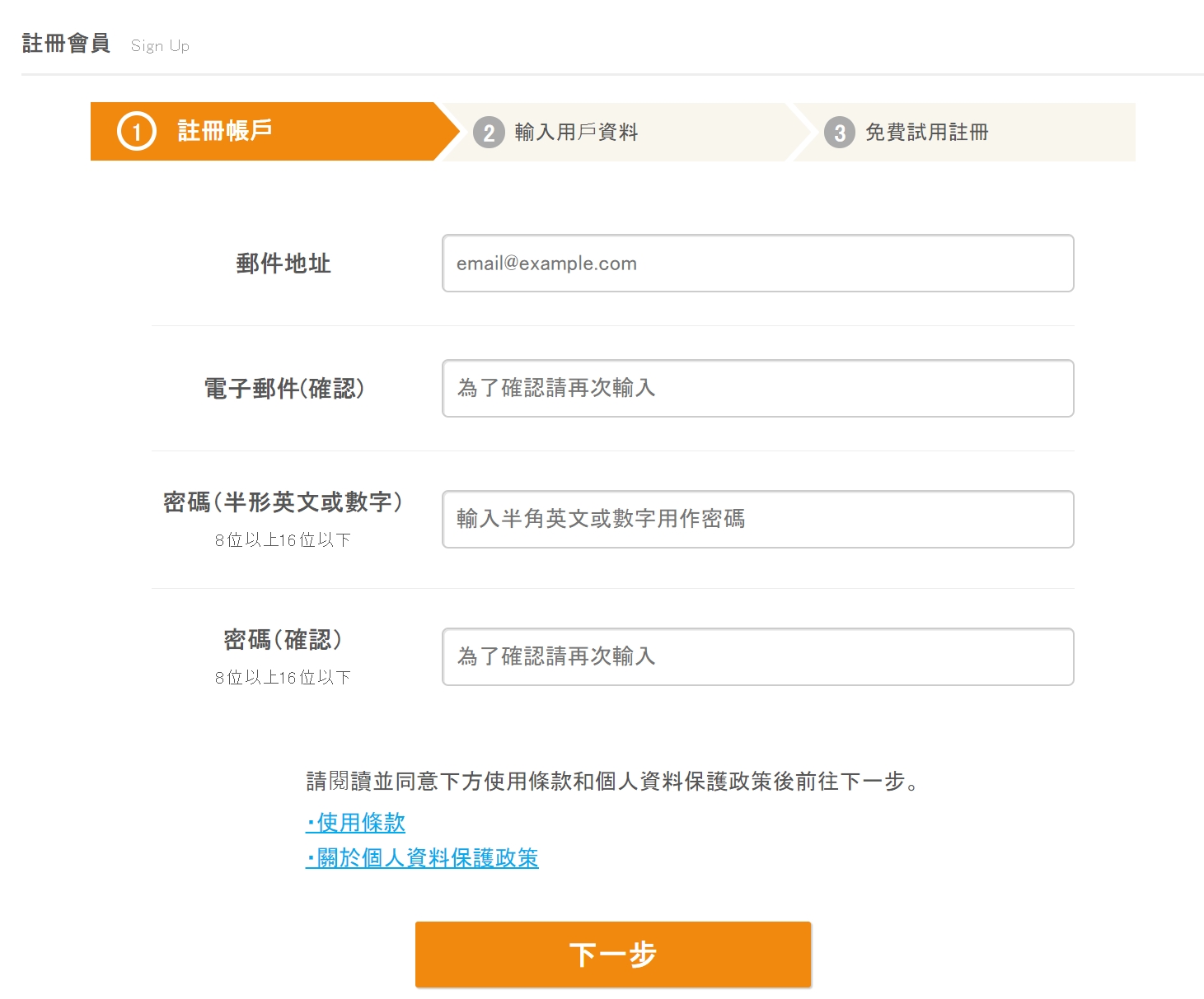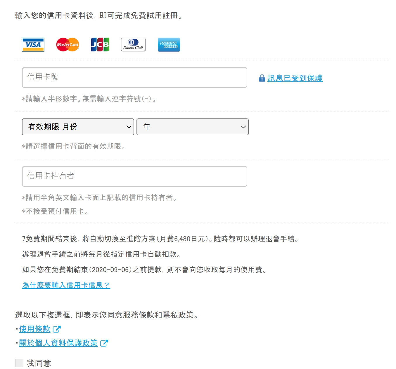 先輸入電子郵件跟預設密碼,之後在輸入用戶訊息,還要輸入信用卡資料,不過不用擔心,信用卡不會立即扣款,訊息會提醒你註冊後的7天就要停止扣款。