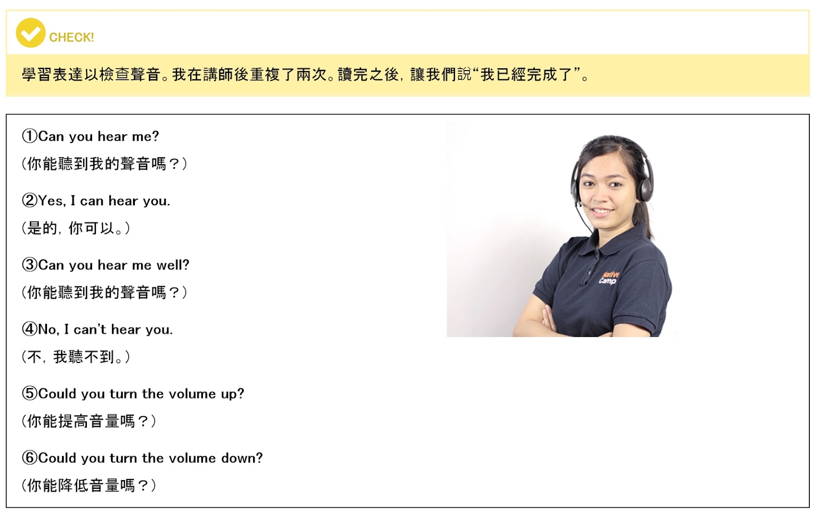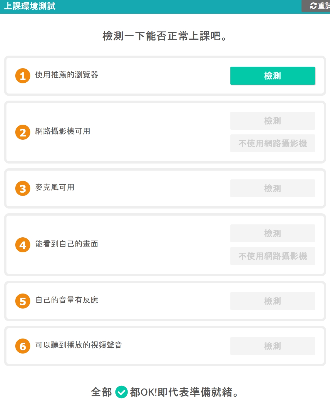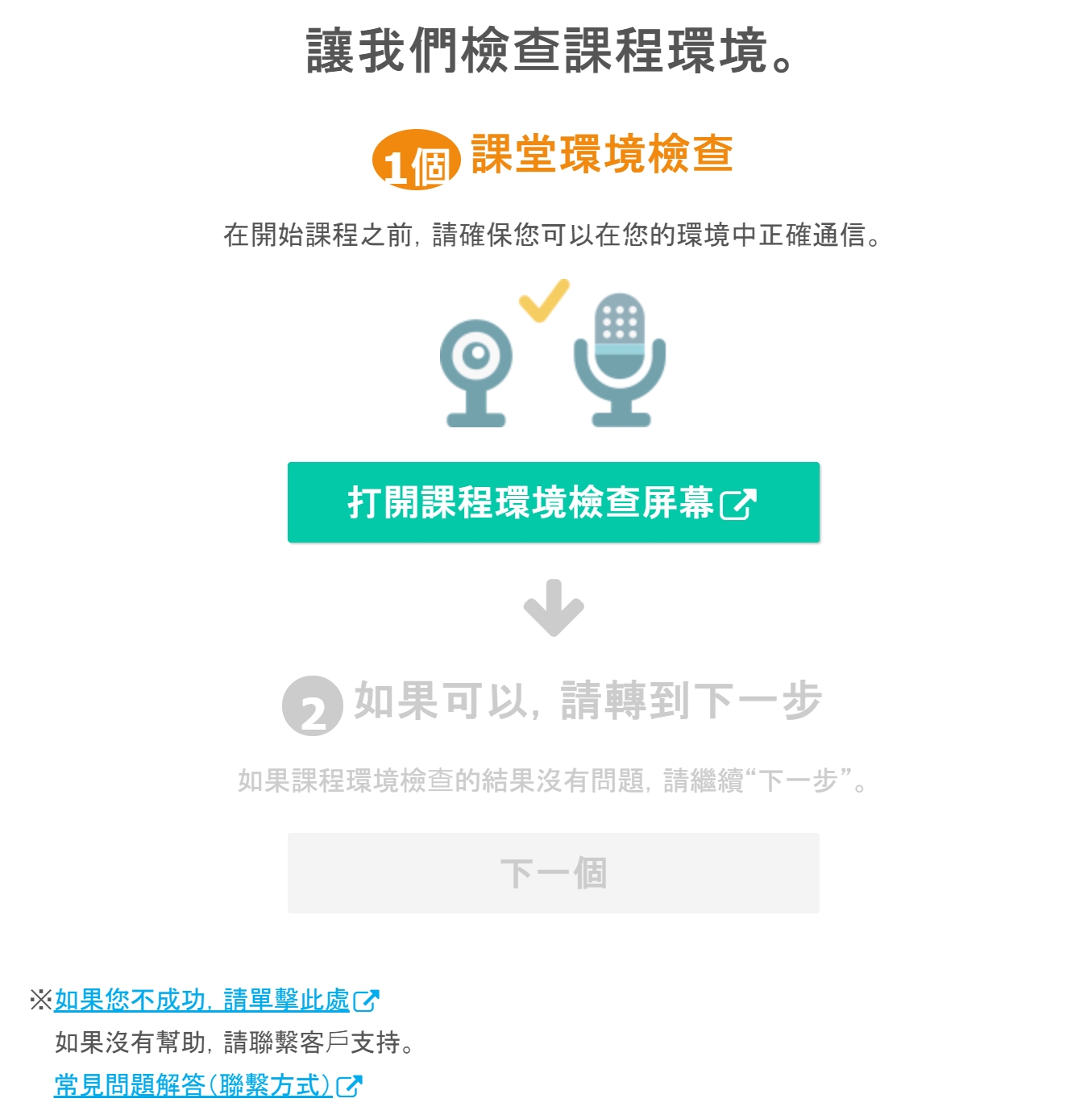 必須測試你的瀏覽器、麥克風、聲音等等,如果沒問題就可以來上課囉:)