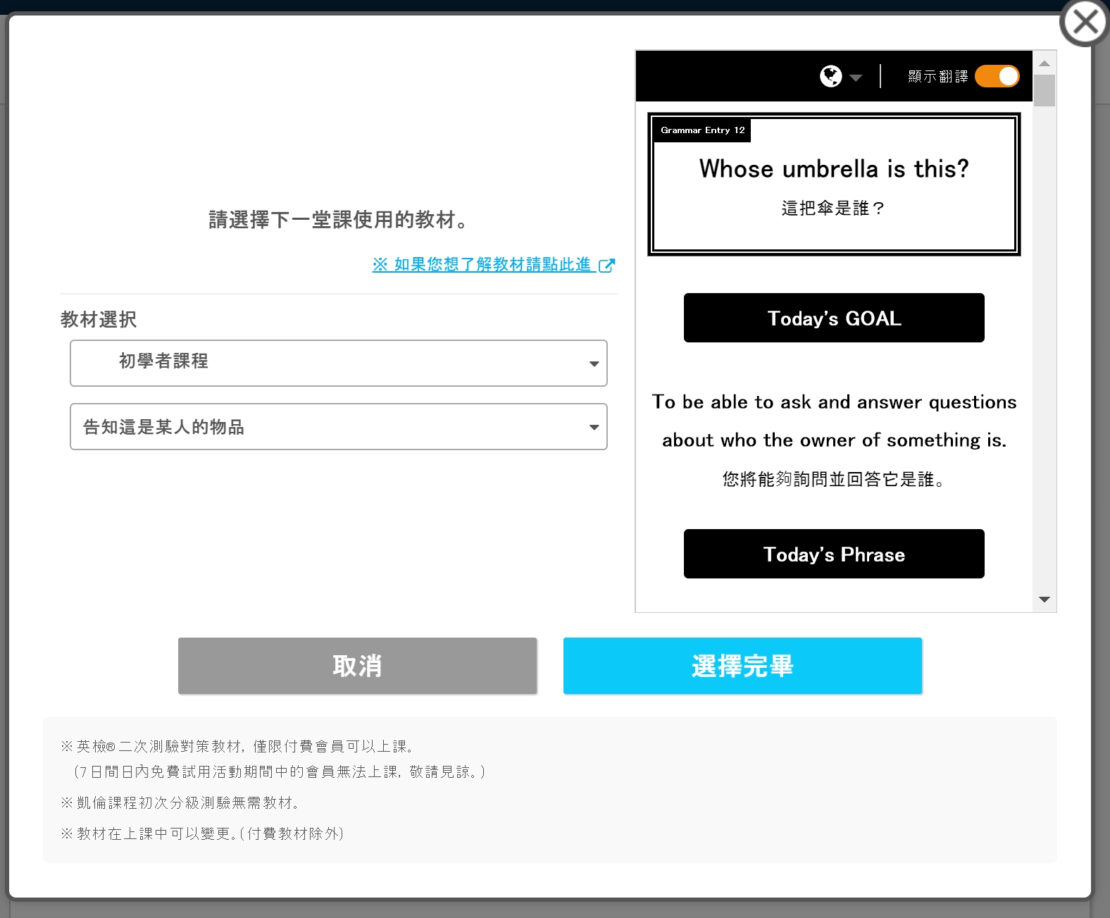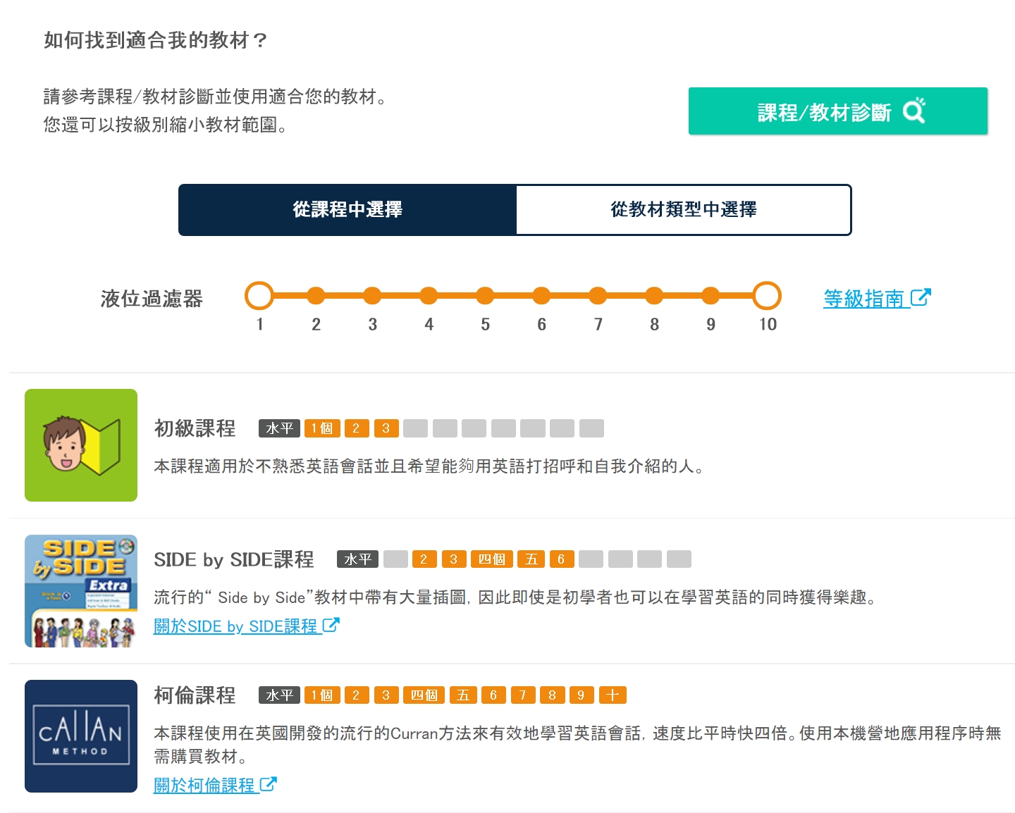 選擇老師點選進去之後,可以聽老師的發音,以及看老師的相關資料,還有教材的選擇,教材的資料都在裡面,如果想要直接跳級學習,可以到教材/課程診斷這邊看自己怎麼學習。