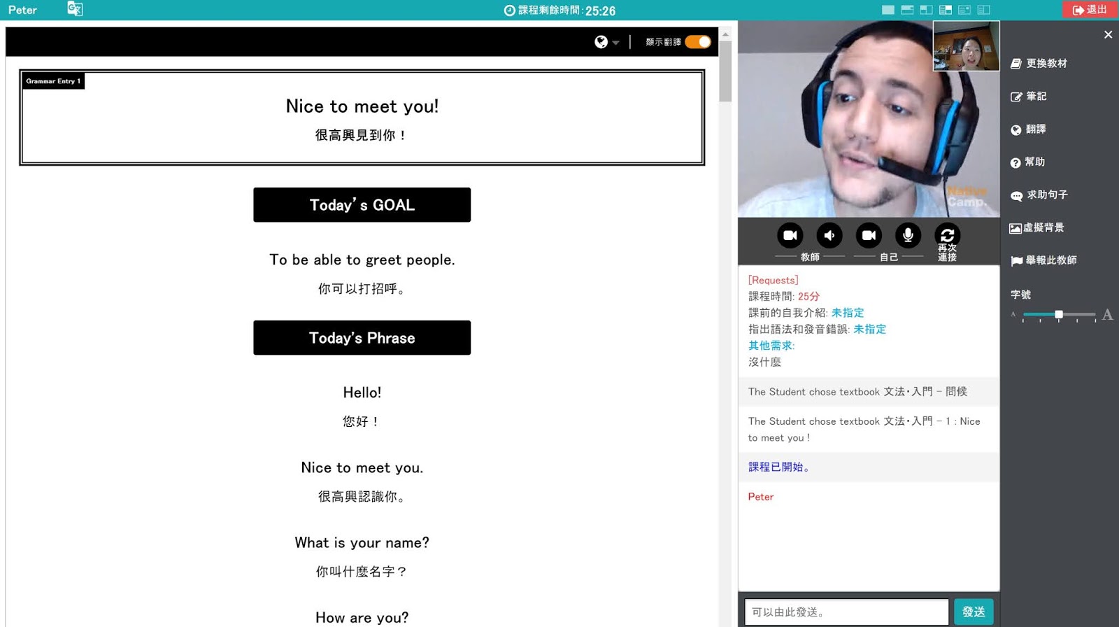 點選立即上課之後,就會連結你跟老師彼此的螢幕,打聲招呼之後依照講義跟老師一對一聊天,右邊可以調整教材跟字型大小,以及跟老師對話。