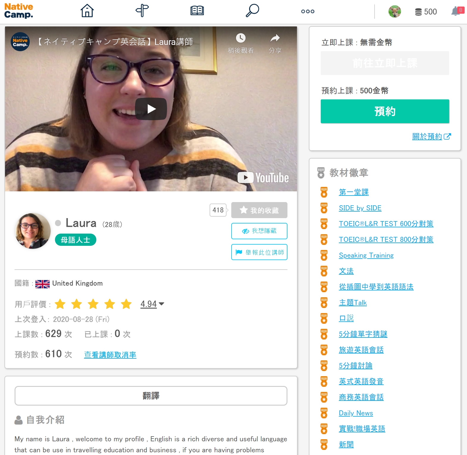 點進去就可以看到老師的基本資料、評論以及所選的教材,如果你想聽老師的發音,你可以直接點選左上的 YOUTUBE,下面還有評分跟反饋,或著直接預定老師的時間,有些熱門的老師則需要金幣,每個免費的帳號都有2500個金幣。