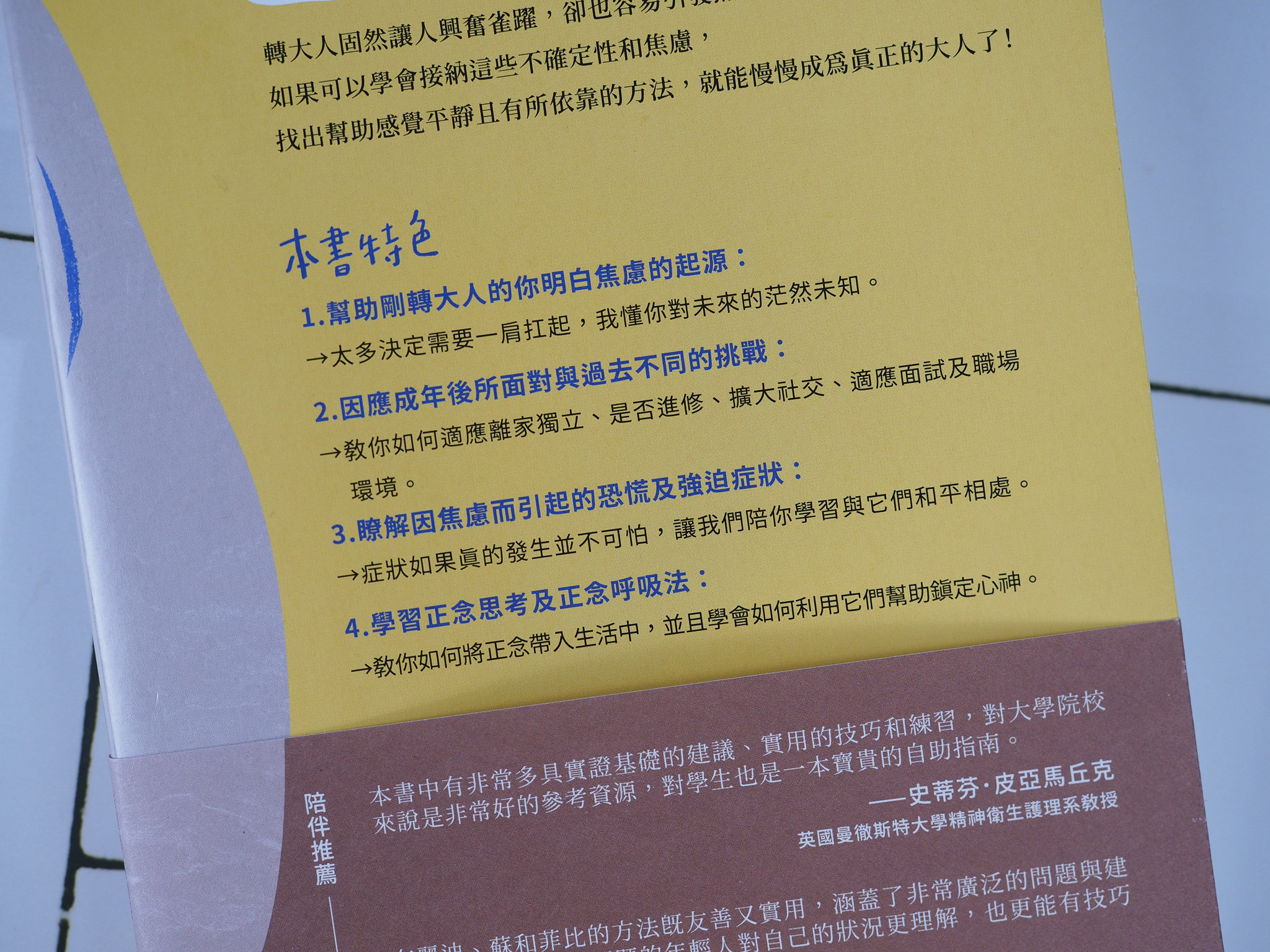 時報推薦了我一本新書《轉大人微焦慮求生指南》,是寫給十八歲焦慮的年輕人,可以幫助剛轉大人的年輕人:一、明白焦慮的來源,二、教你如何適應離家獨立、面試與職場環境,三、了解因焦慮引起的恐慌症與強迫症,四、教你如何將正念帶入生活。