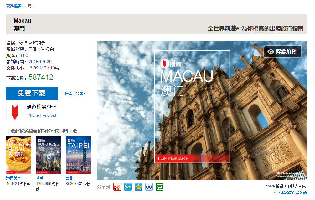 裡面就包含了關於澳門、交通、到推薦景點以及美食推薦,建議也可以下載窮遊網的APP,也可以免費下載錦囊,還可以離線檢視。基本上裡面就包含了所有該須要注意的項目資料。