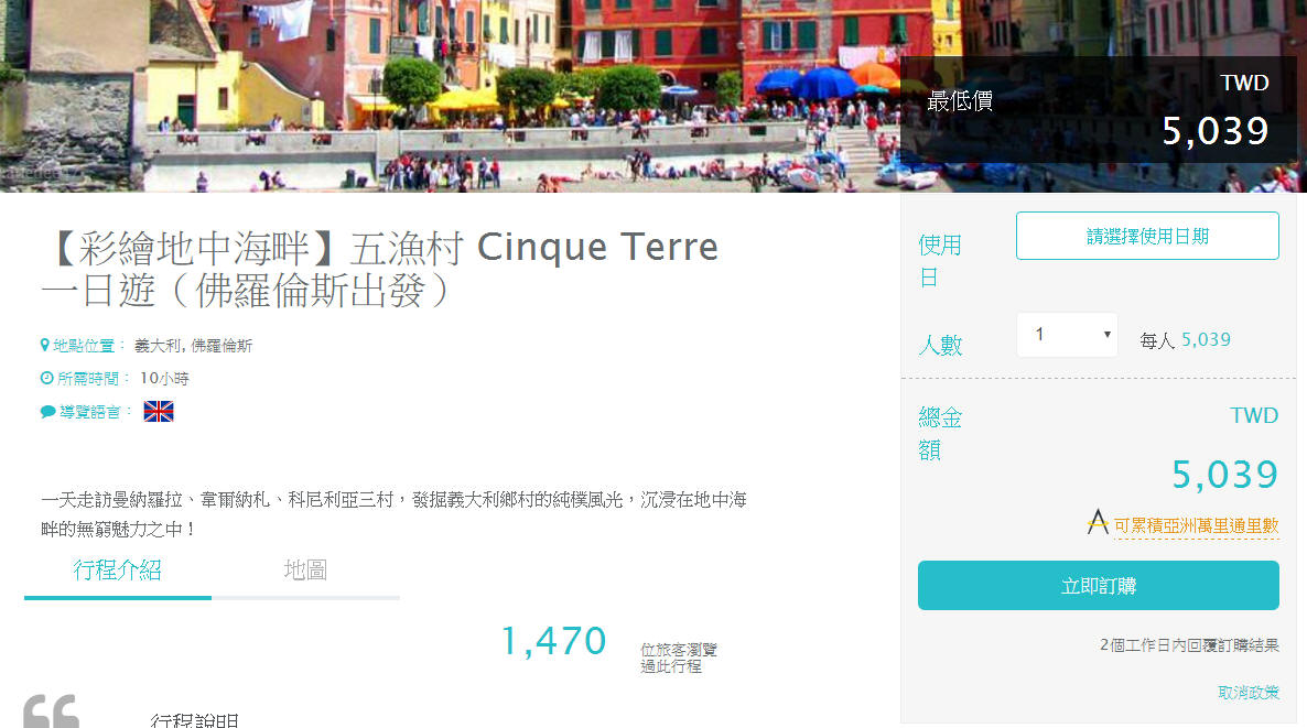 好處就是省去查許多班車銜接的麻煩,而且可以直接從佛羅倫斯出發,一天行程就可以讓你走遍主要的五漁村景點,不過壞處就是無法盡情的時間玩耍,許多人都說五漁村要兩天以上的時間才能感受當地,不過跟團的好處就是有專人導覽跟說明,取自己覺得重要的就好。