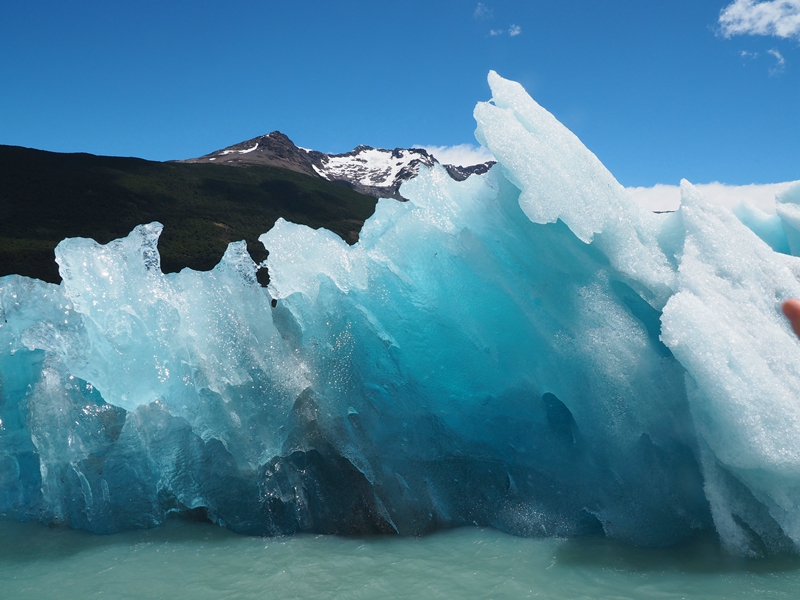 在阿根廷湖航行的過程,會經過一些從冰川上掉落下來的冰山塊,有些美的像是藍色的寶石般,閃閃發亮,彷彿就像水中的寶藏。