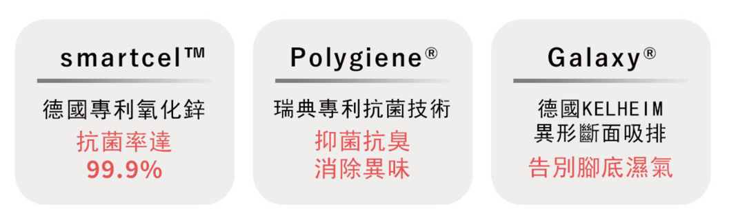 而Polygiene® 瑞典銀離子技術則有抗菌、抑臭的功能,有些人雙腳一離開了鞋子,就會散發出濃烈的味道,很多人以為是腳臭,但其實是因為腳無法順利排汗,混合著不好的纖維。