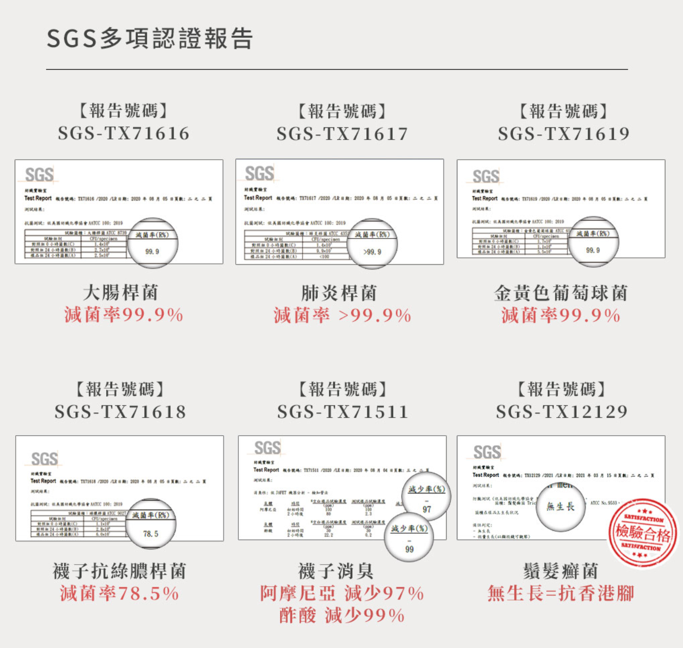 以上所有商品都獲得SGS認證,長效抗菌率高達99.9%,消臭率減少97%,有效抑制惱人腳臭,可以告別腳底濕氣,再也不用擔心腳氣讓人生氣。