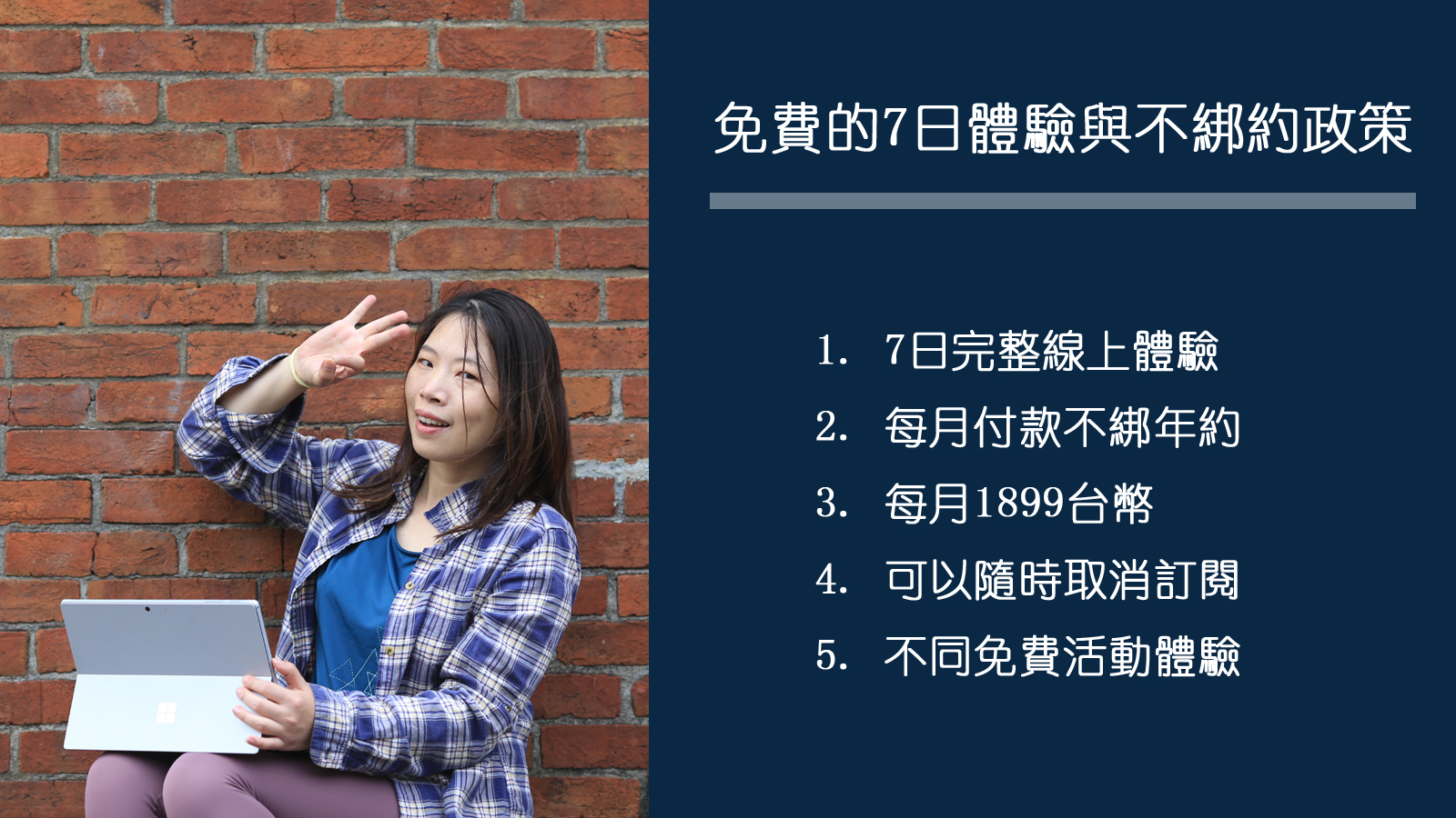 在Native Camp.有免費的7日體驗,這是最基本的,比起其他坊間只有幾堂課的體驗來說,Native camp給的絕對大方,7天24小時無限制課程體驗,真正喜歡你才購買,不會將學習語言變成功德箱,而且擁有非常彈性的繳費制度,沒有年度綁約,也沒有終生會員制度,每個月信用卡扣款一次,每月費只要1899台幣。