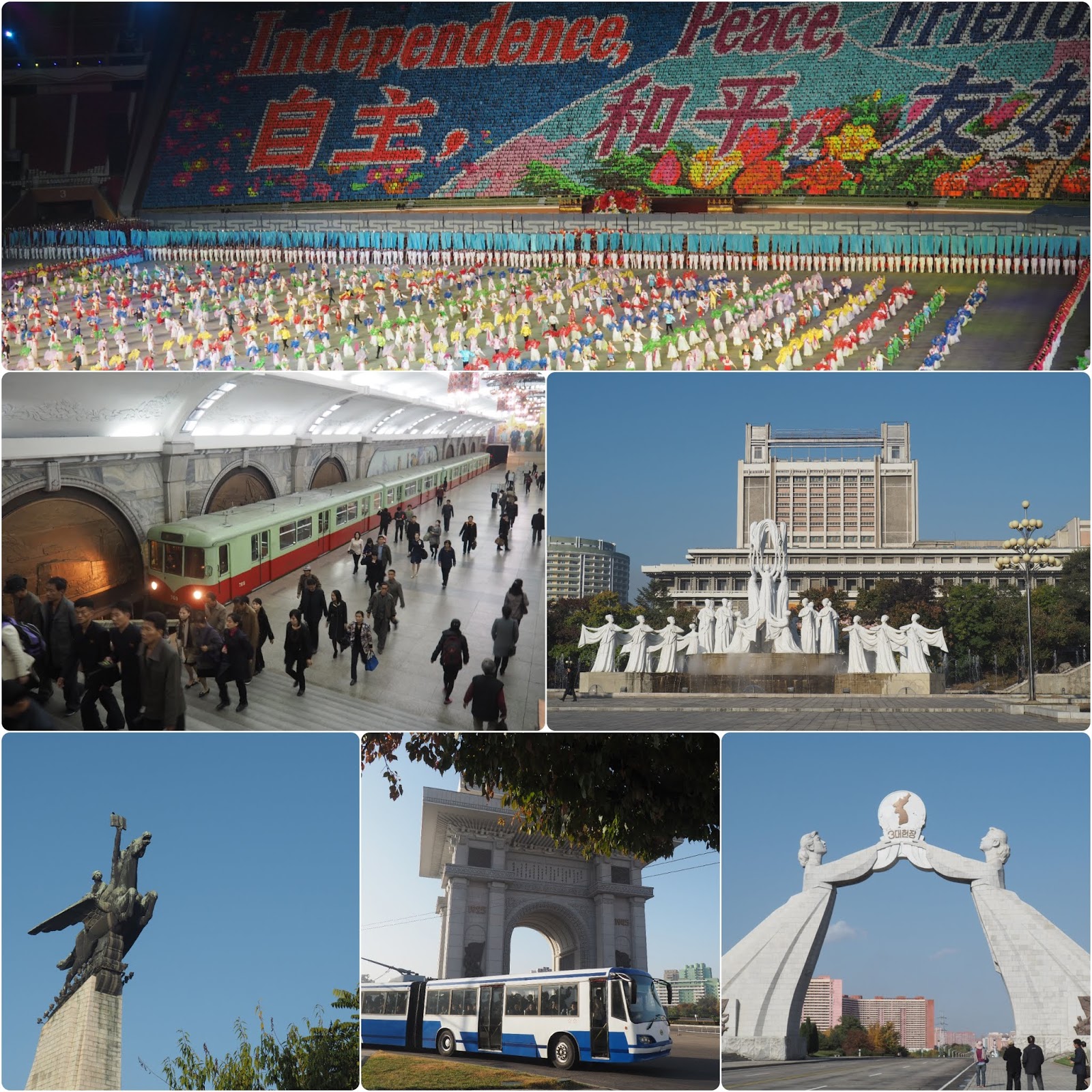景點包括萬壽台噴水公園、千里馬銅像、人民大學習堂、平壤地下鐵、滄田大街、祖國統一大三憲章、平壤少年宮(或學校)、金日成廣場、雜技秀、凱旋門、主體思想塔、大同江遊船等等,晚上還有十萬人祖國的光輝萬體操秀。