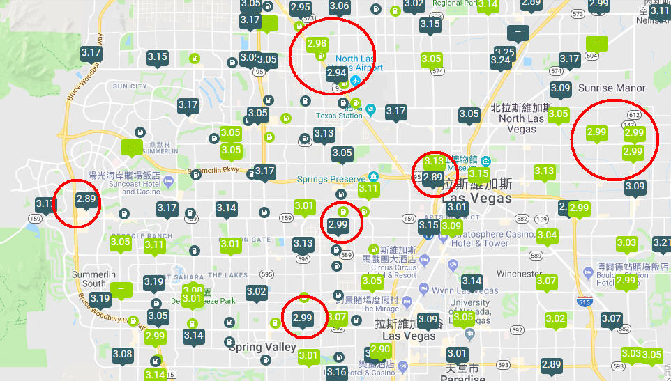 可以下載 Gasbuddy 查詢不同地區不停加油站的油價,像我們在拉斯維加斯中途就家到將近一加侖4美金的油,但是到了拉斯維加斯就只剩下3美金,每一加侖差1美金,就差超多。